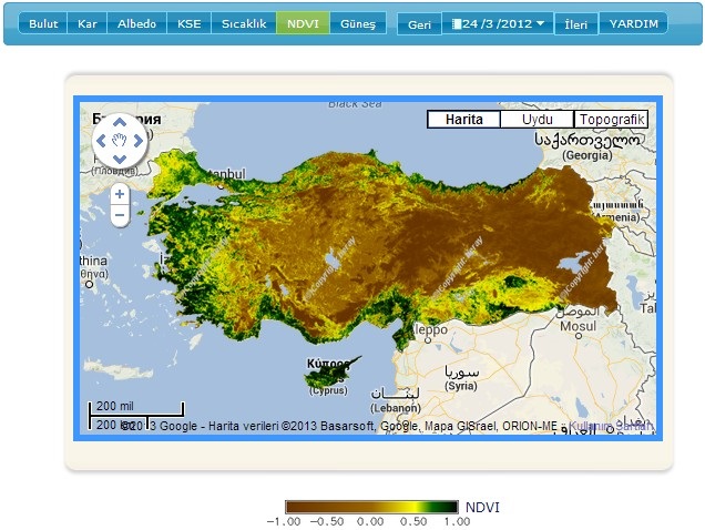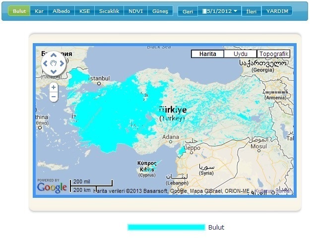 Shortly named as UTUVA (Satellite Based National Data Archive), the project produces maps of hydrology, agriculture, transport, energy, tourism, meteorology and such maps that several disciplines require as; cloud, snow covered area, albedo, vegetation index, snow water equivalent, sun radiation and surface temperature are produced daily and real-time and data starting from the year 2000 are archived.